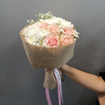 Яркая композиция из французских роз Найтингейл, хризантемы Момоко, ароматных нарциссов и маттиолы с эвкалиптом в коробке