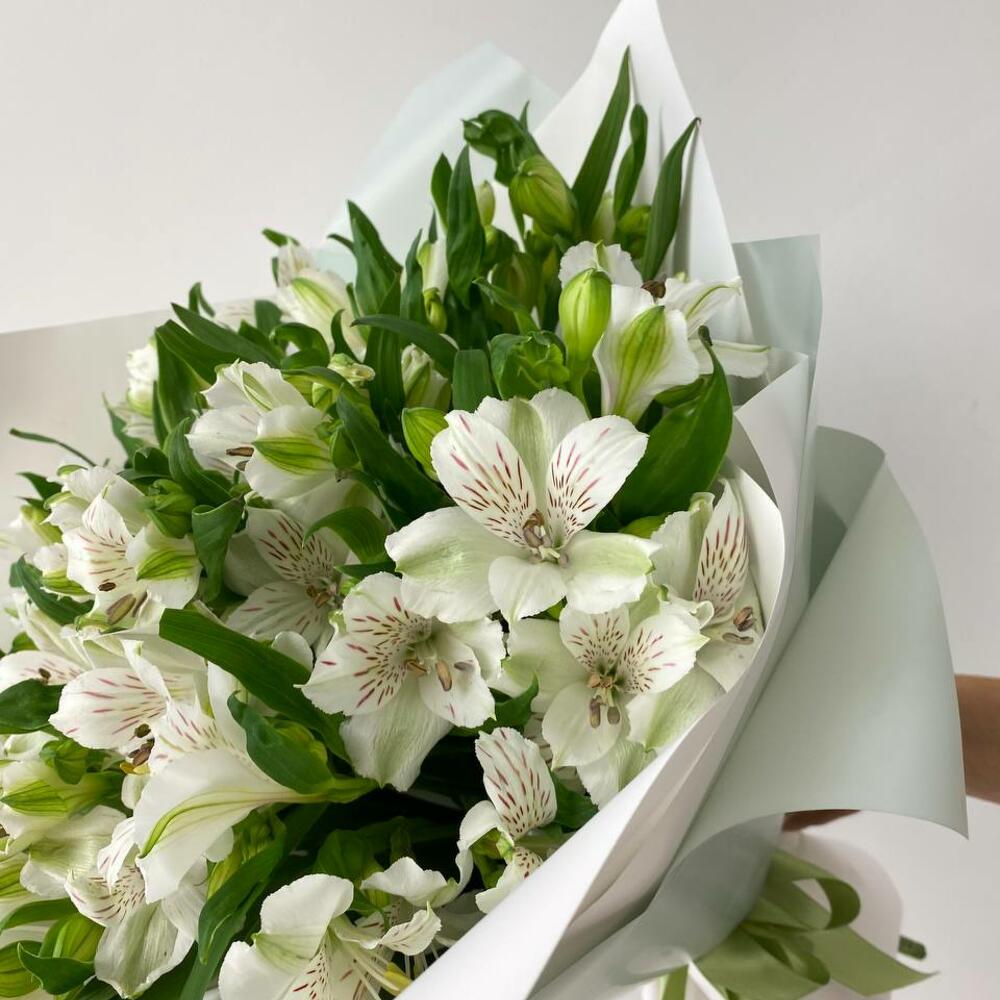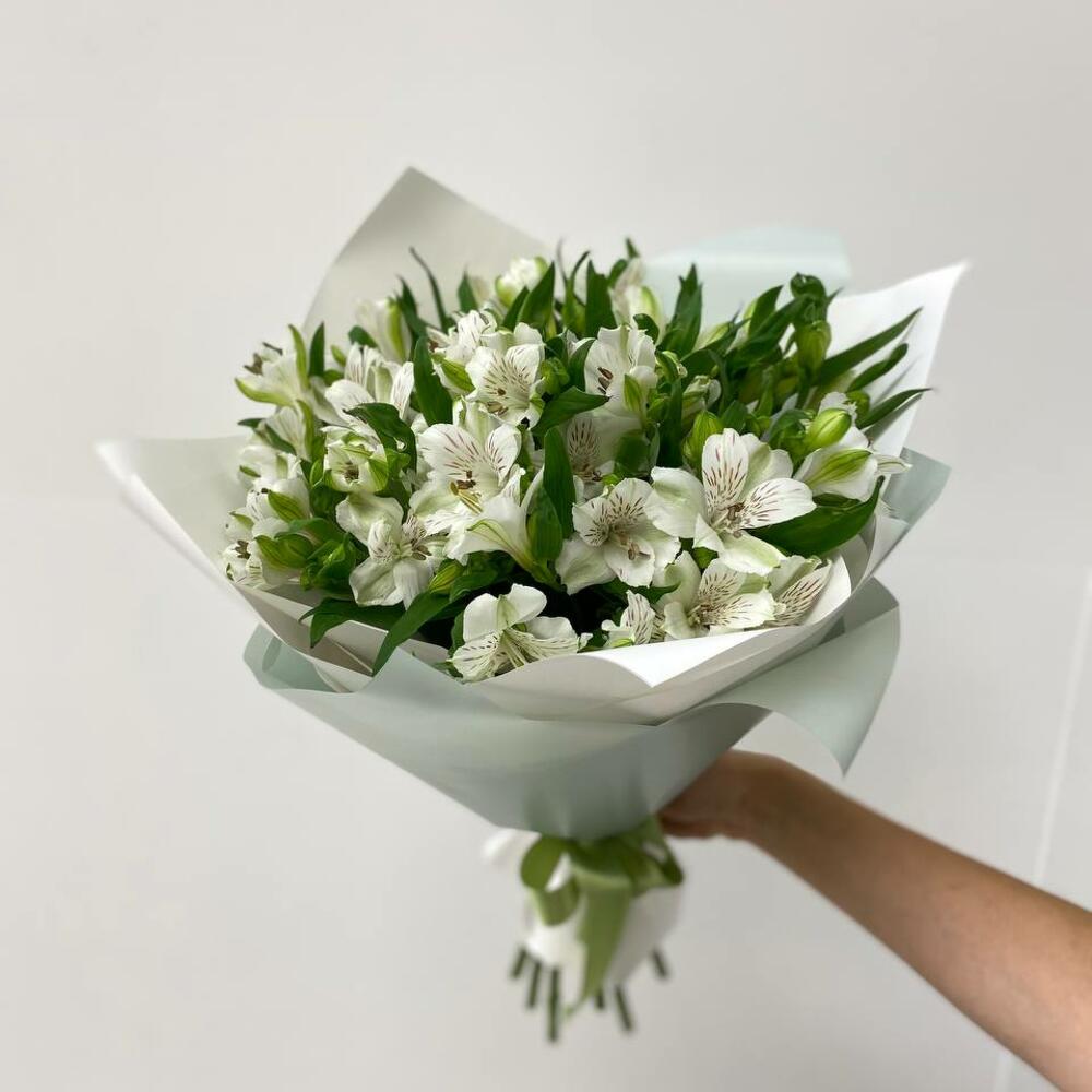 Лента – 1 шт.Альстромерия белая – 9 шт.бумага дизайнерская – 1 шт.