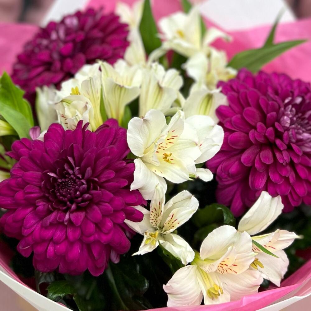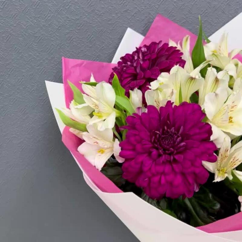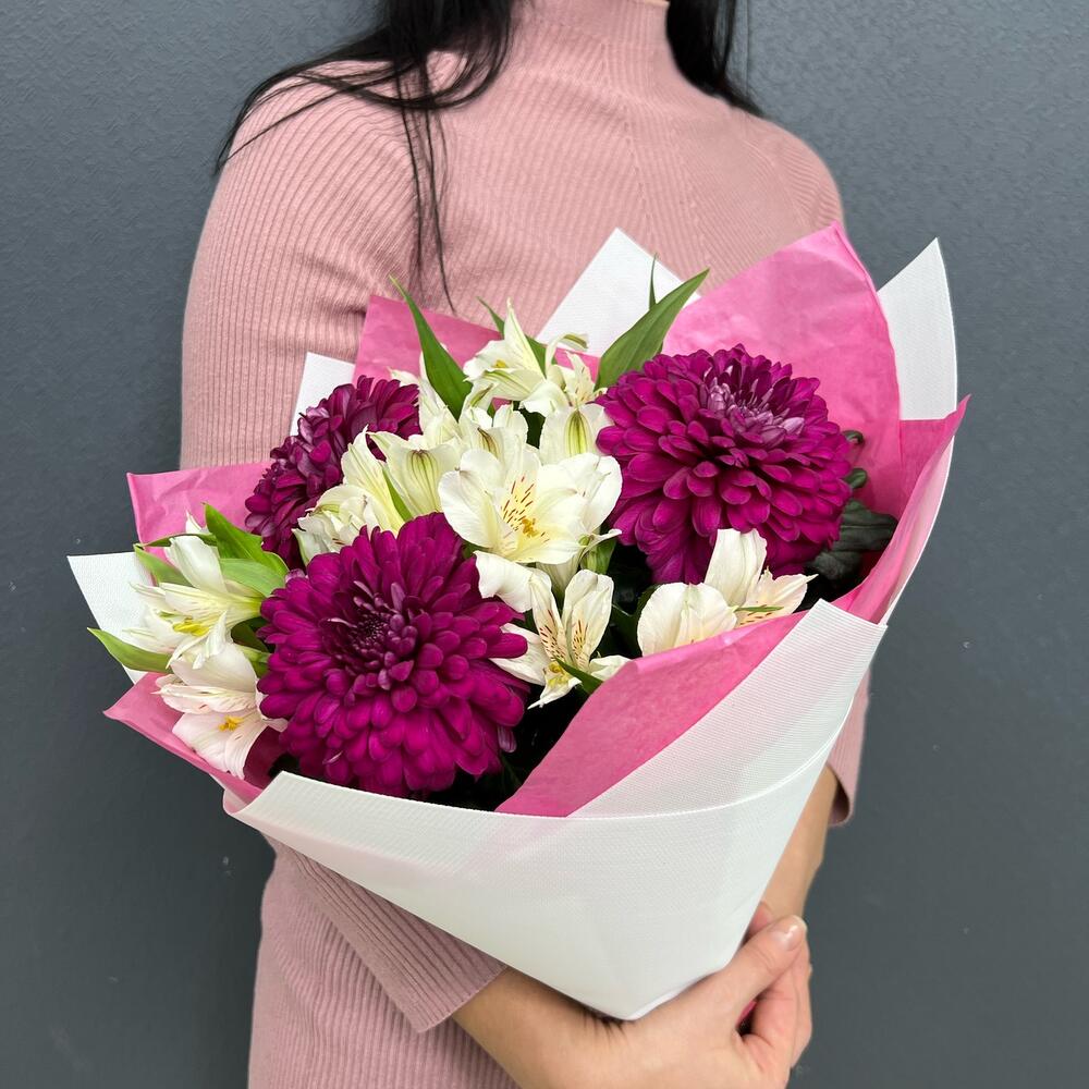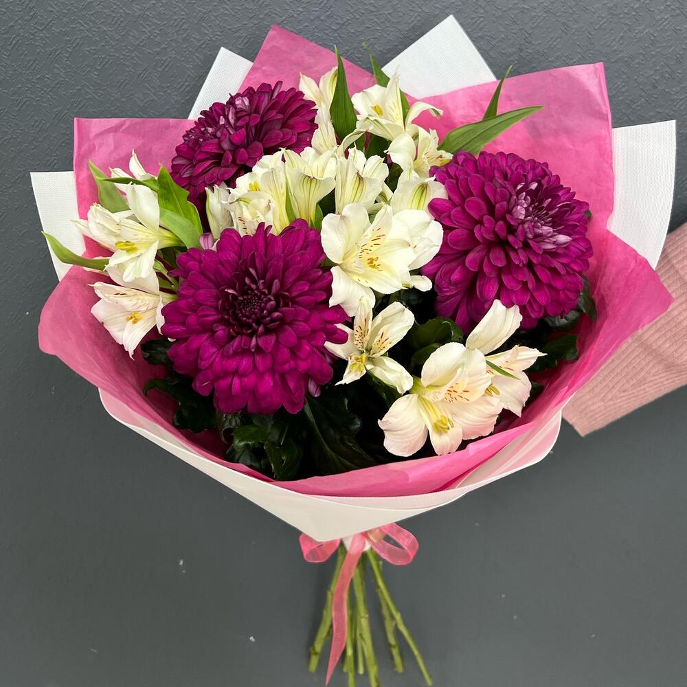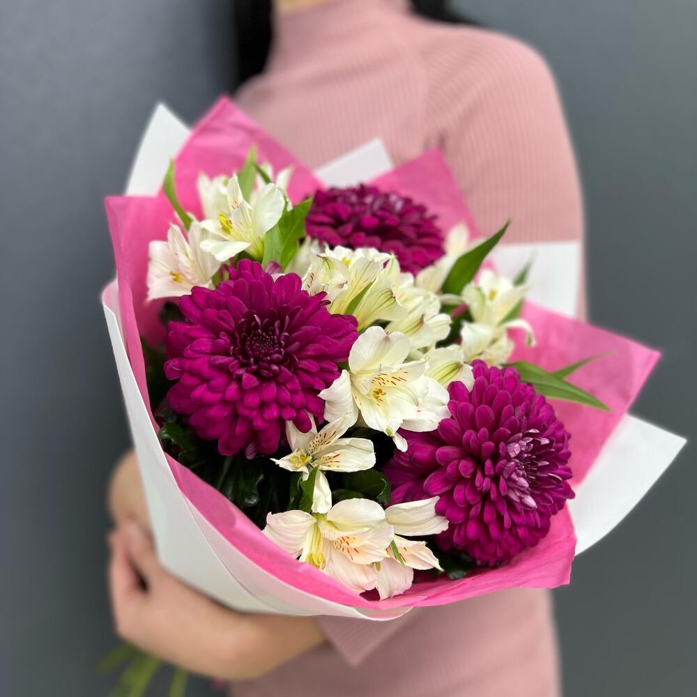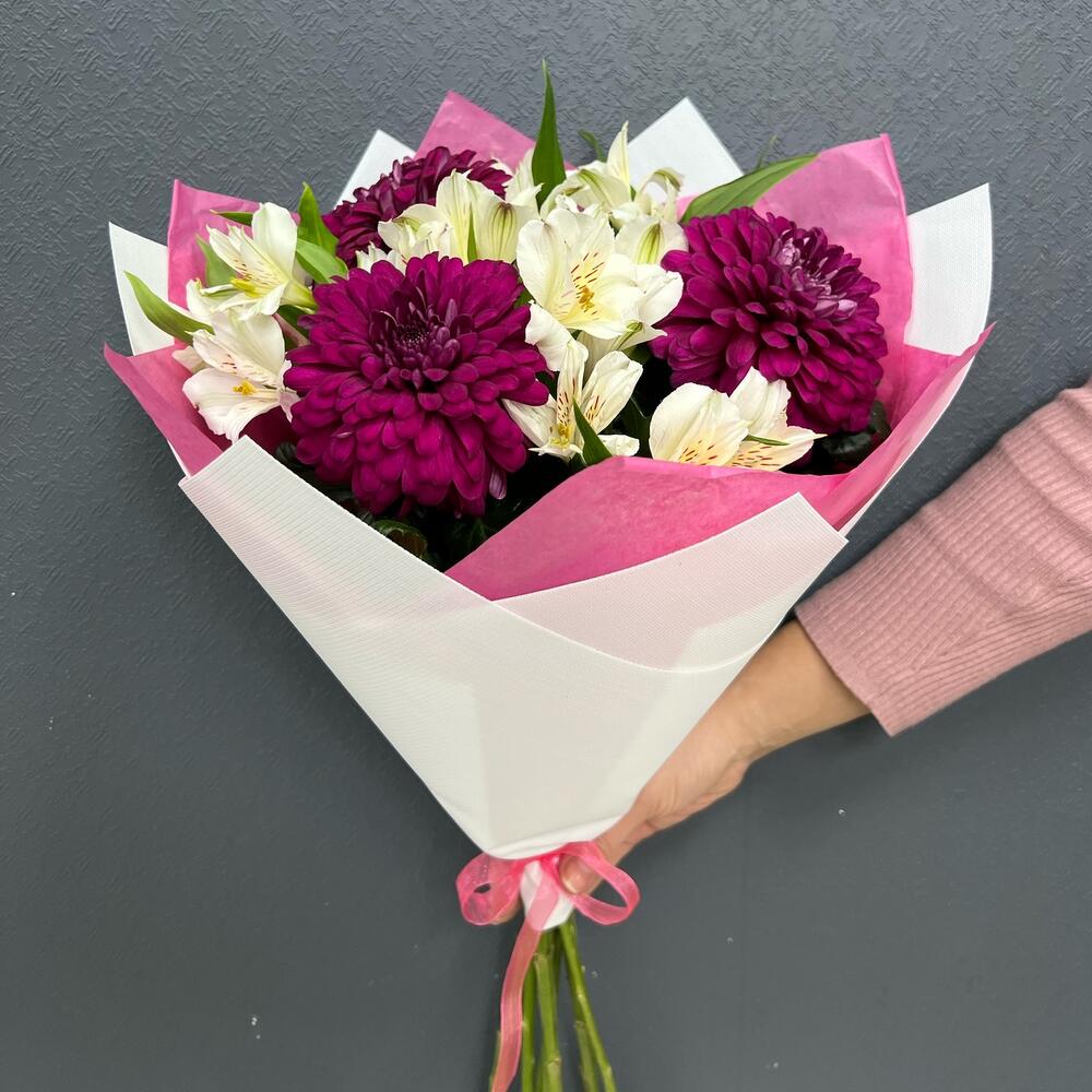Альстромерия – 4 шт.Лента атласная – 2 шт.Тишью – 2 шт.Пленка матовая – 2 шт.ламира – 3 шт.