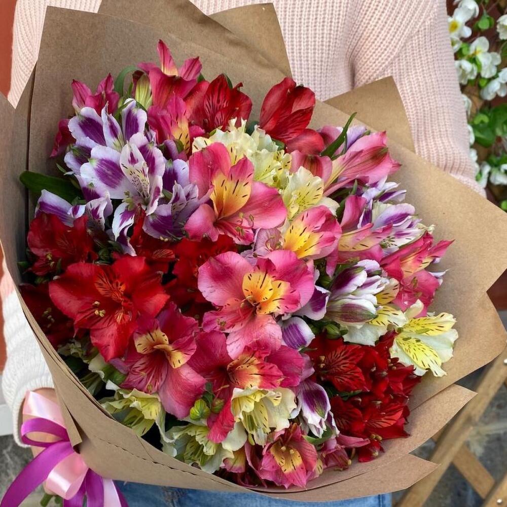 Лента атласная – 2 шт.Альстромерия Микс Европа – 15 шт.Крафт бумага – 3 шт.