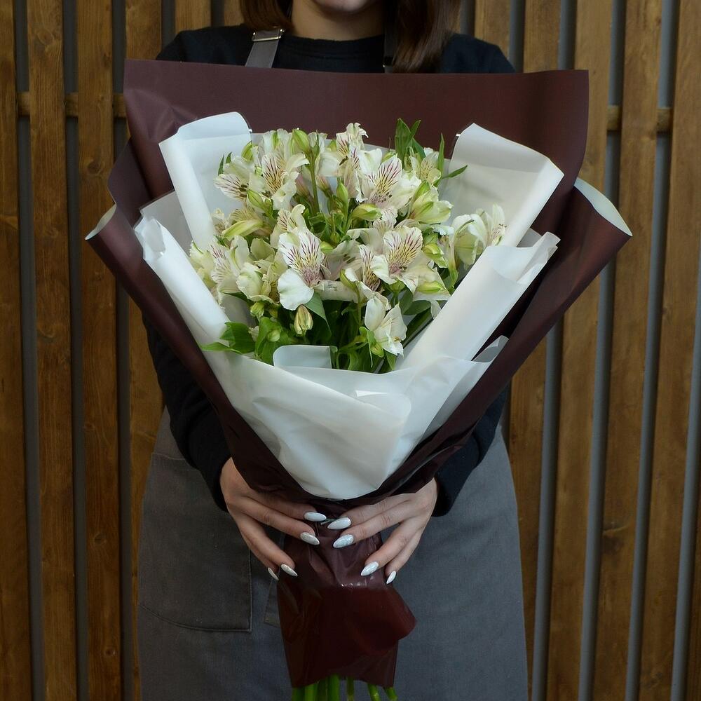 Красивый и стильный букет из белой альстромерии в оригинальной упаковке.В составе букета: белая альстромерия 15 веточек, оригинальная упаковка букета.