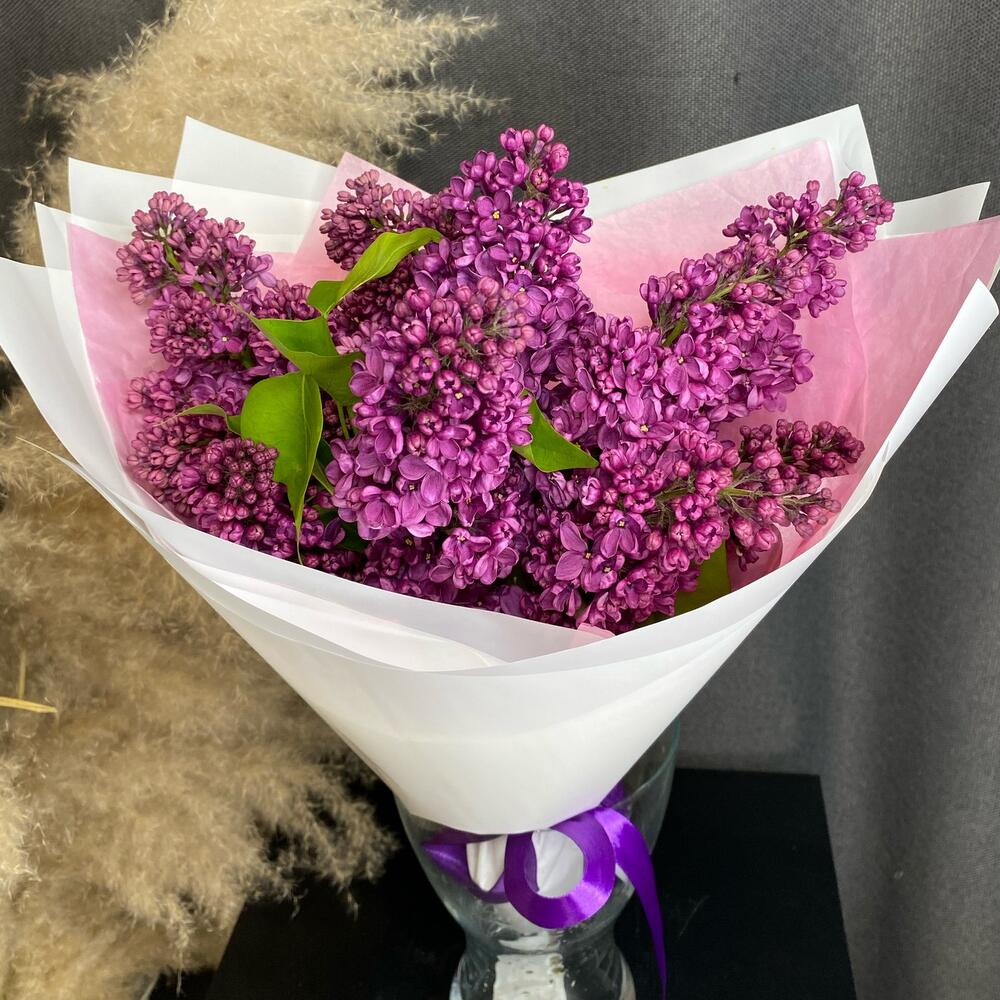 Сирень – 9 шт.Тишью – 1 шт.Атласная лента – 1 шт.Дизайнерская упаковка – 1 шт.
