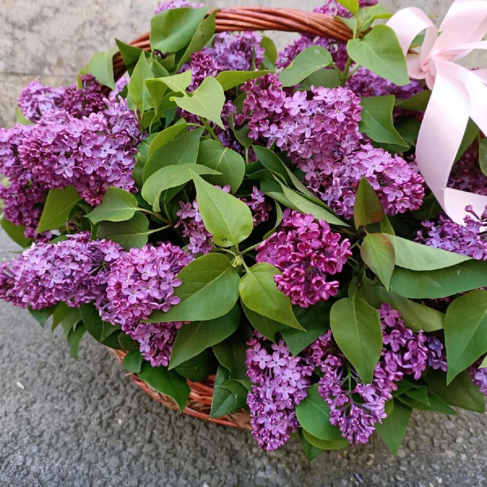 Сирень – 11 шт.Лента атласная – 1 шт.Корзина плетеная – 1 шт.Пленка матовая – 1 шт.Оазис флористический – 2 шт.