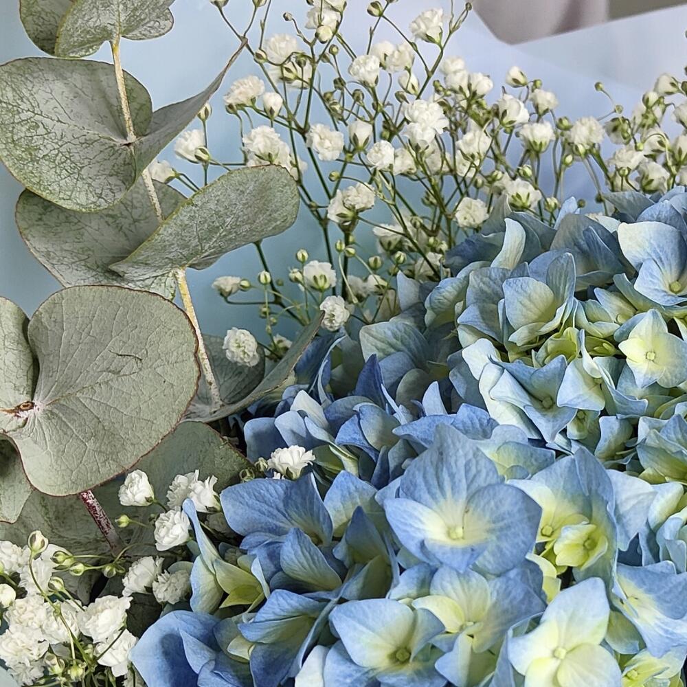 Букет из гортензии, гипсофилы и ароматного эвкалипта