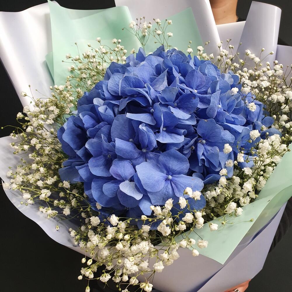 Гортензия – 1 шт.Гипсофила – 2 шт.Упаковка дизайнерская – 1 шт.Лента атласная – 1 шт.