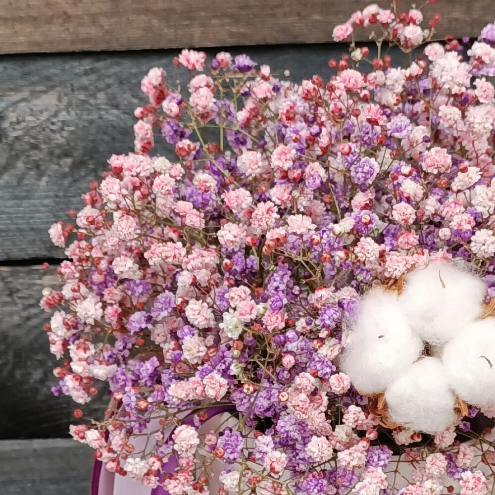Гипсофила – 4 шт.Хлопок – 1 шт.Лента атласная – 1 шт.Шляпная коробка – 1 шт.Оазис флористический – 1 шт.