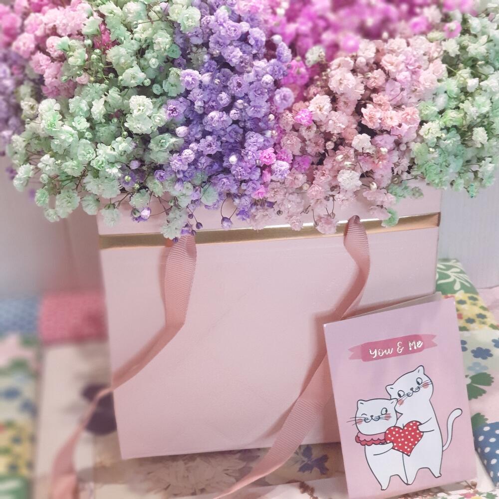 Открыточка с вашими пожеланиями – 1 шт.Оазис флористический – 1 шт.гипсофила радужная – 9 шт.сумочка с ручками – 1 шт.любовь флориста (бесплатно) – 1 шт.