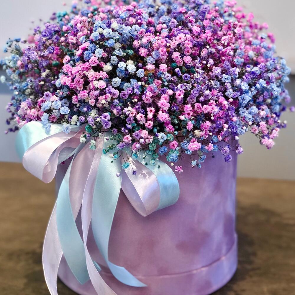Коробка бархатная – 1 шт.Оазис флористический – 1 шт.Гипсофила – 10 шт.