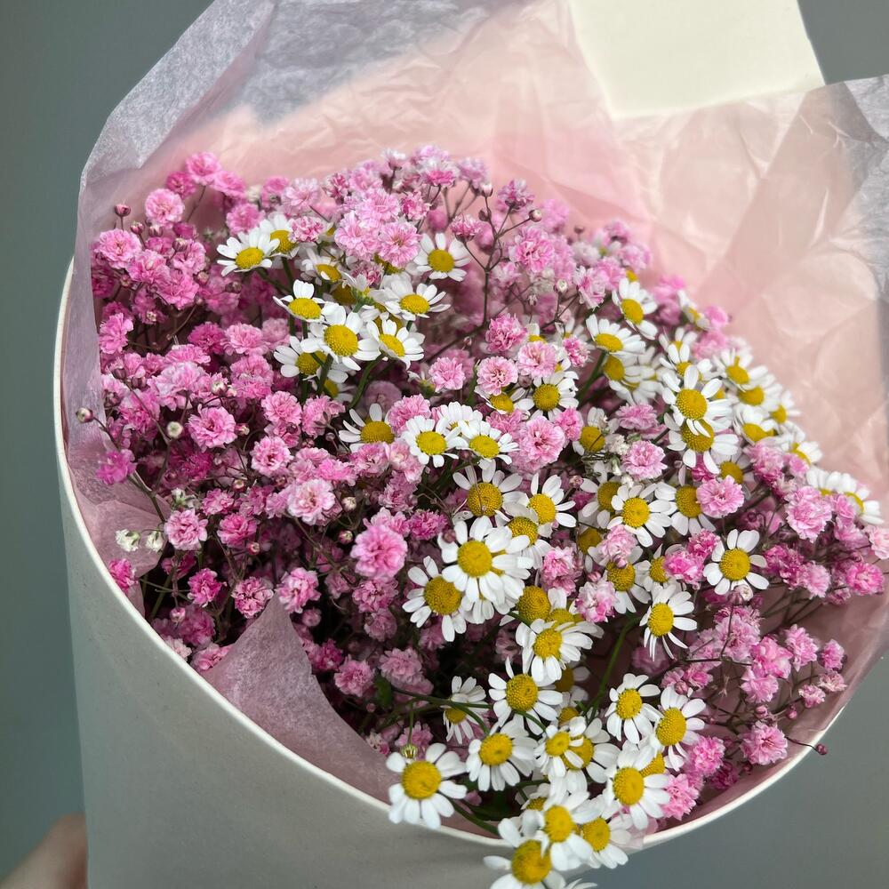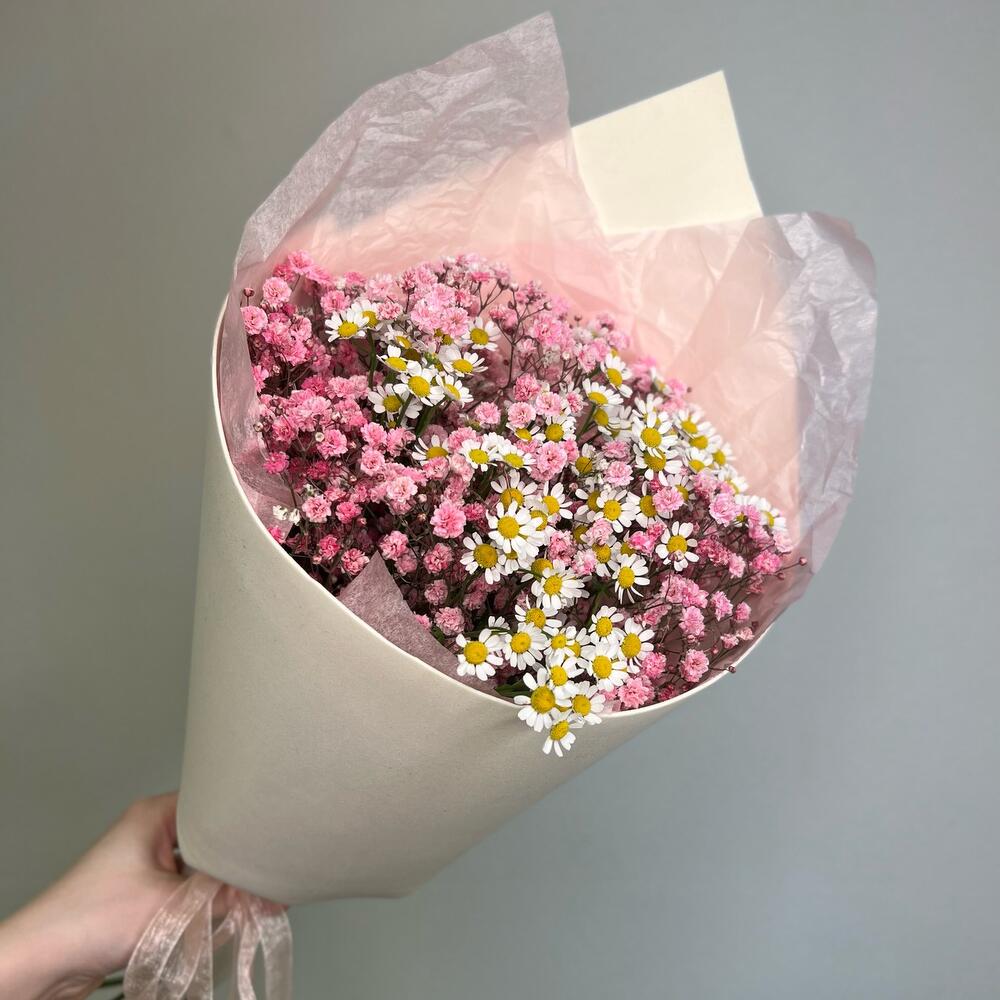 Нежный кулечек из розовой гипсофилы и ромашки