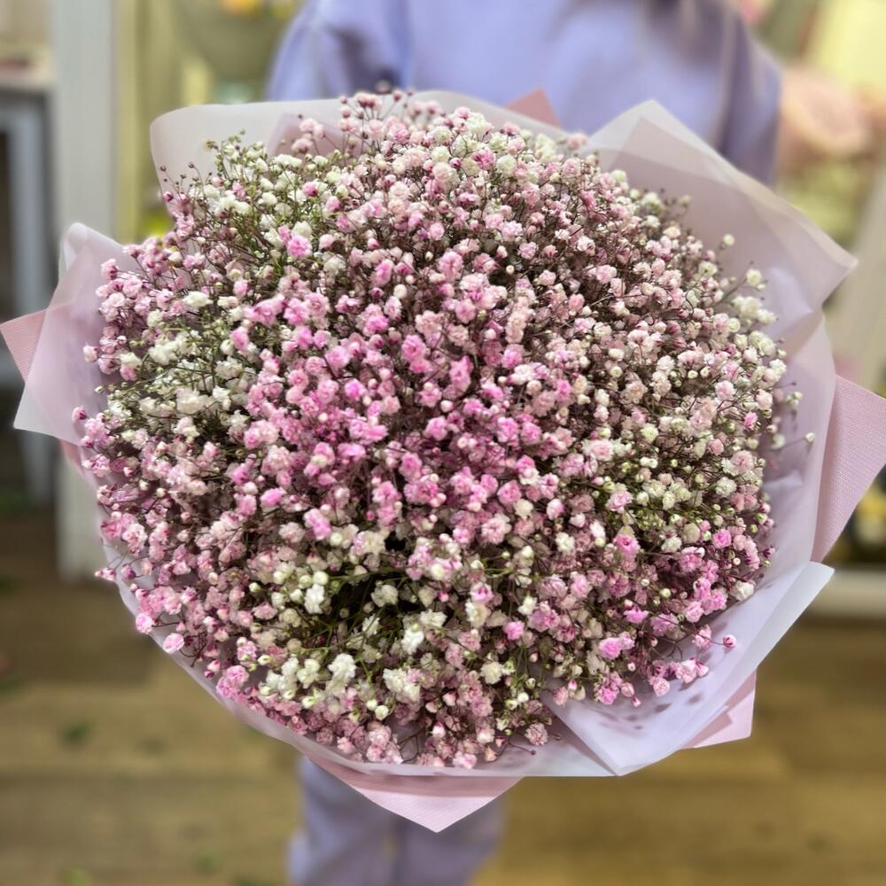 тематическая открытка – 1 шт.гипсофила бело – розовая – 15 шт.диазайнерская упаковка – 1 шт.