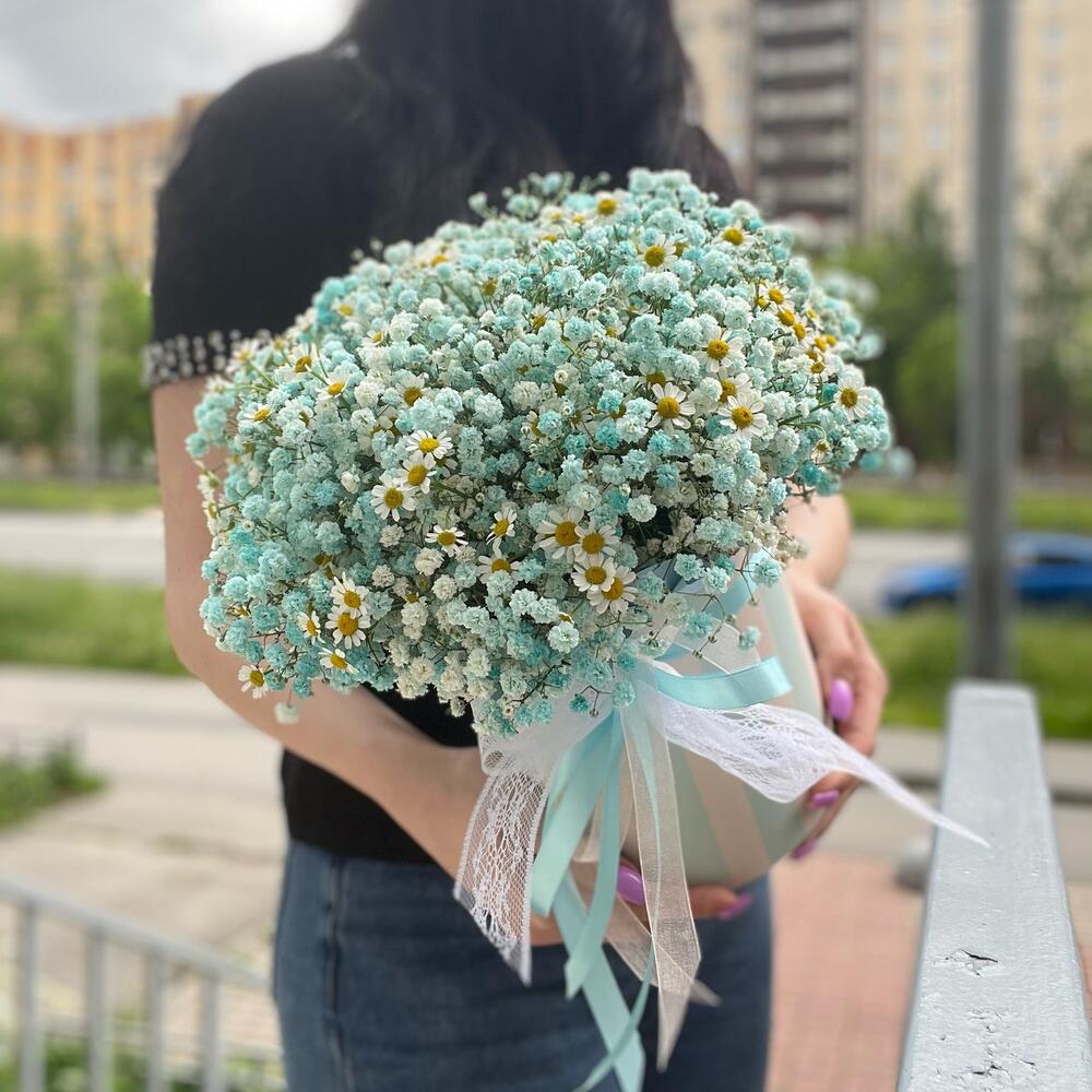 гипсофила радужная – 7 шт.Матрикария – 4 шт.Коробка шляпная – 1 шт.Лента атласная – 3 шт.