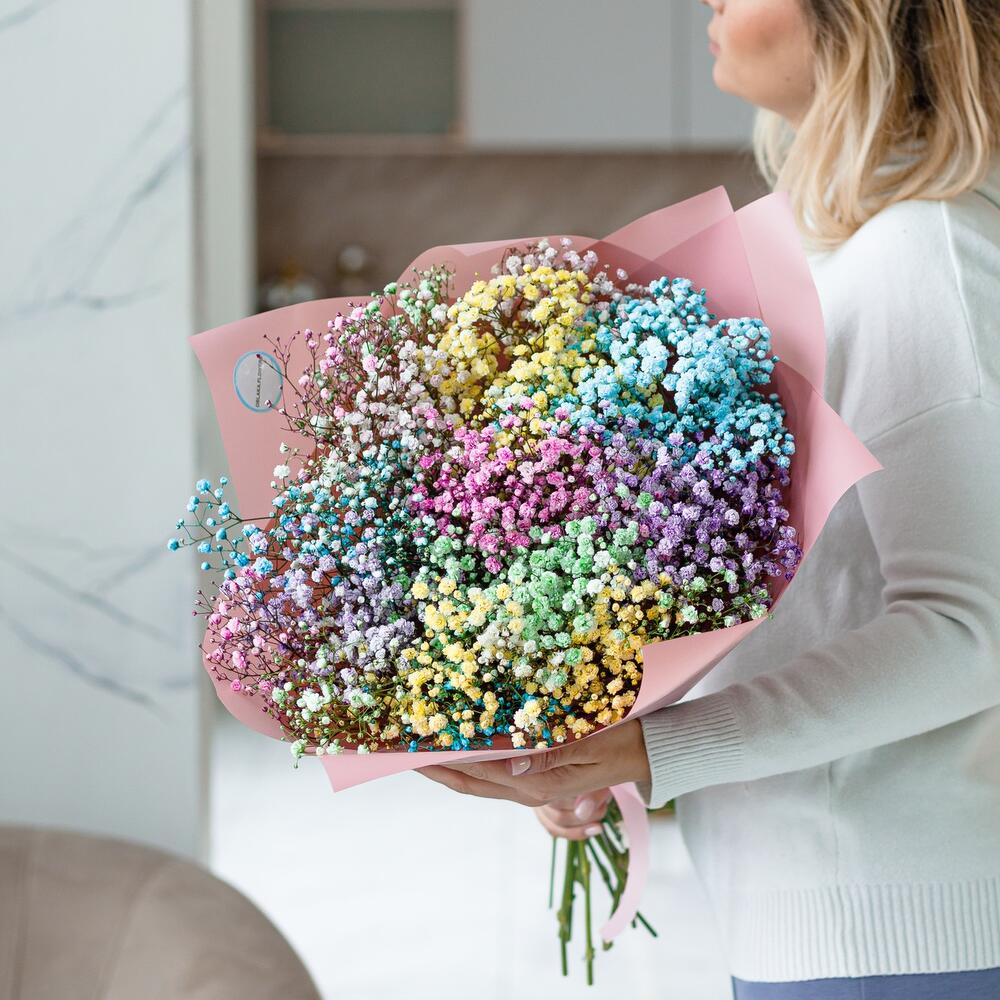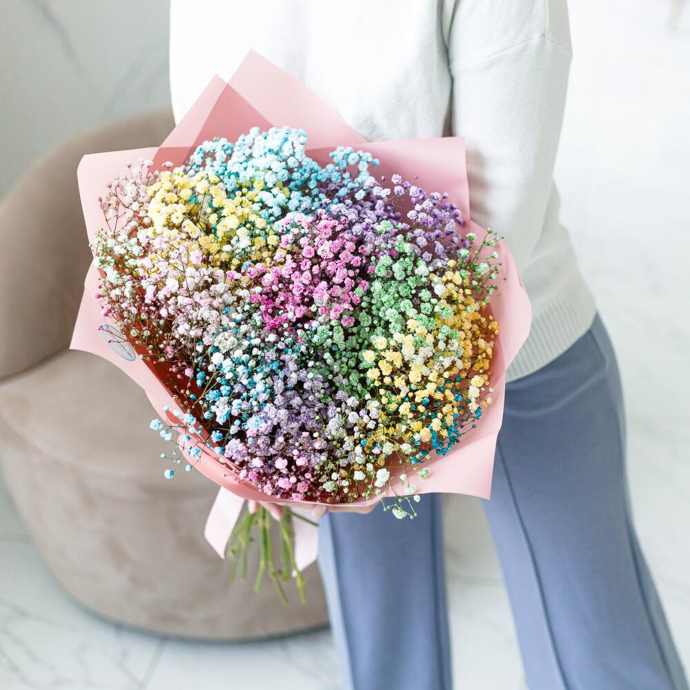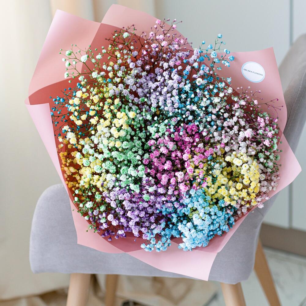 Шикарный букет из воздушной гипсофилы. Ни одна дама, точно не останется равнодушной при виде такой радуги .Инструкция по уходу за цветами прикреплена к каждому заказу.Цветы гипсофилы отличаются стойкостью и даже при высыхании не теряют, декоративности и цвета. Что позволяет, долгое время украшать интерьер в качестве сухоцветов.Подпишем открытку с вашими пожеланиями бесплатно