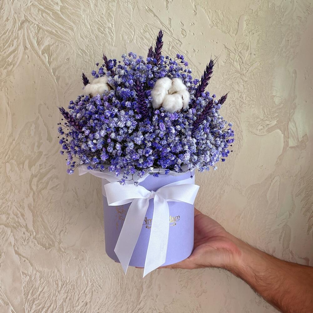 “Сиреневый туман” – композиция из гипсофилы в шляпной коробке