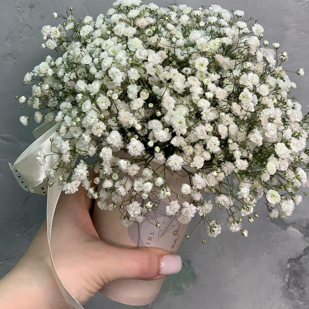 Гипсофила – 4 шт.Оазис флористический – 1 шт.лента бант – 2 шт.крафтовый дизайнерский Стакан – 1 шт.