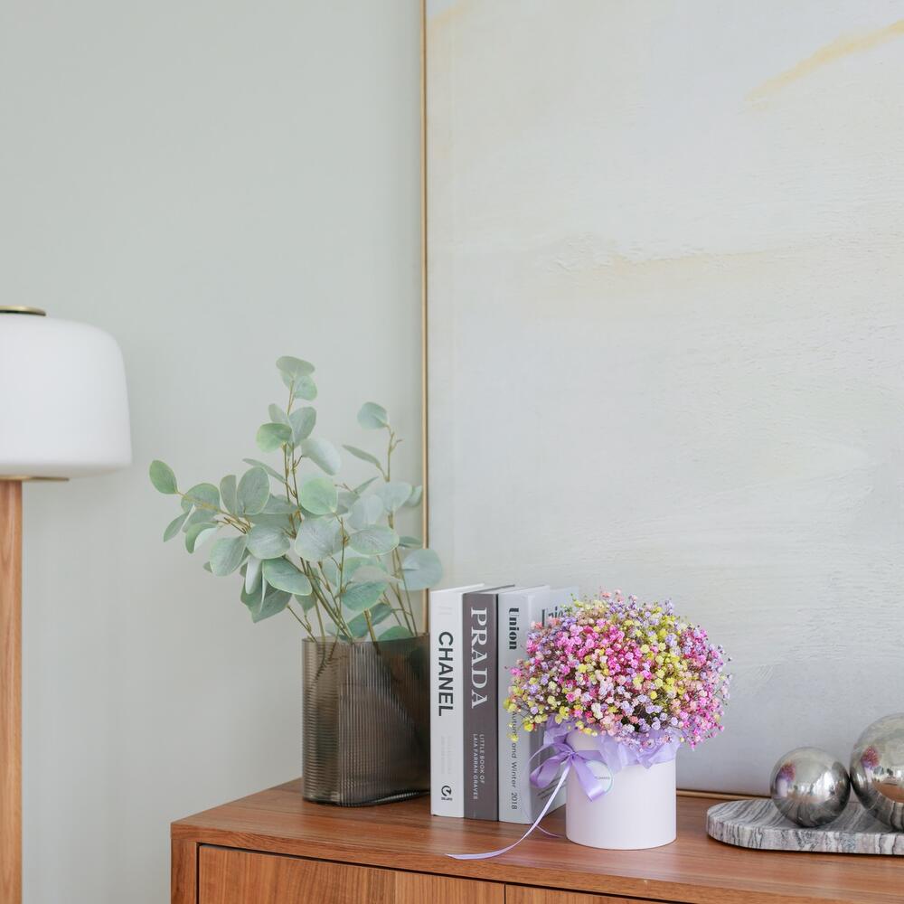 Очаровательная, воздушная композиция из гипсофилы, в шляпной коробке.Цветы стоят в специальной флористической губке,что позволяет им больше оставаться свежими и радовать получателя. Так же композиция в коробке это очень удобно и эффектно, так как не надо ставить букет в вазу и менять воду. Необходимо лишь подливать в губку воду.Инструкция по уходу за цветами прикреплена к каждому заказу.Цветы гипсофилы отличаются стойкостью и даже при высыхании не теряют, декоративности и цвета. Что позволяет, долгое время украшать интерьер в качестве сухоцветов.Подпишем открытку с вашими пожеланиями бесплатно