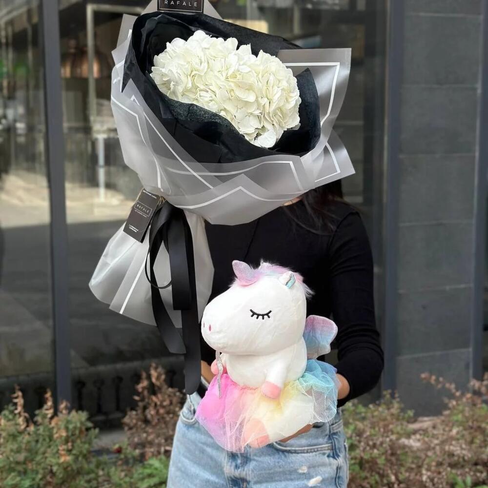 В наш фирменный сет "PROFF 2.0" входят букет "SOLO 8.0" из 1 голландской гортензии в оформлении и милый единорог размера S! Выбрав сет от RAFALE, Вы скрасите день обладательницы сета и подарите ей незабываемые эмоции.