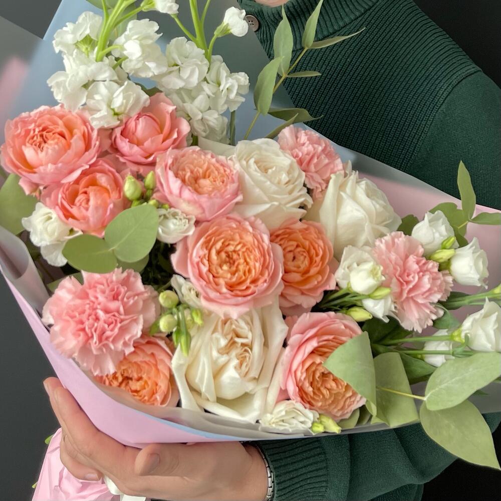 Лизиантус – 2 шт.Маттиола – 2 шт.Эвкалипт – 1 шт.Гвоздика – 3 шт.Фисташка – 3 шт.Упаковка дизайнерская – 3 шт