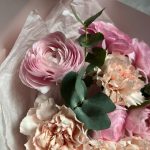 Ранункулюс – 5 шт.диантусы – 5 шт.Эвкалипт – 2 шт.декоративная упаковка – 1 шт.Атласная лента – 1 шт.