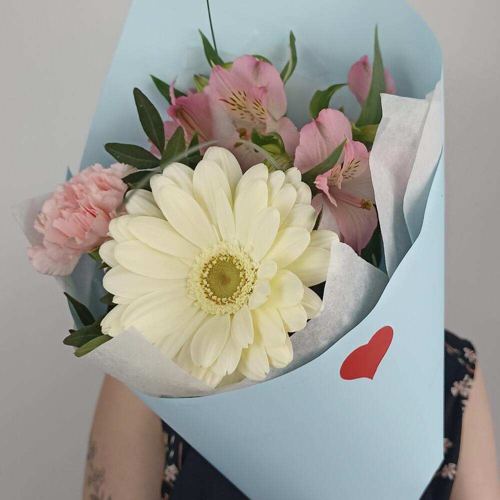 Гербера – 1 шт.Альстромерия – 1 шт.Диантус – 1 шт.Фисташка – 1 шт.Тишью – 2 шт.Пленка матовая – 1 шт.