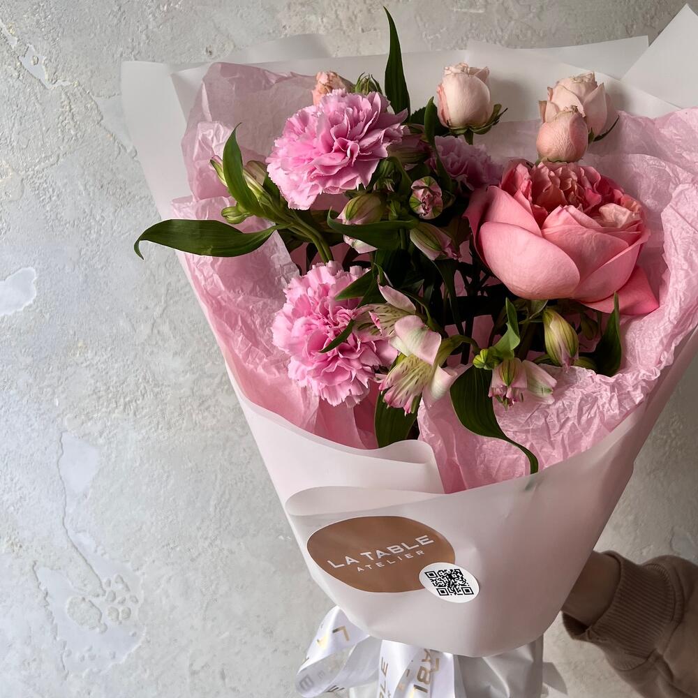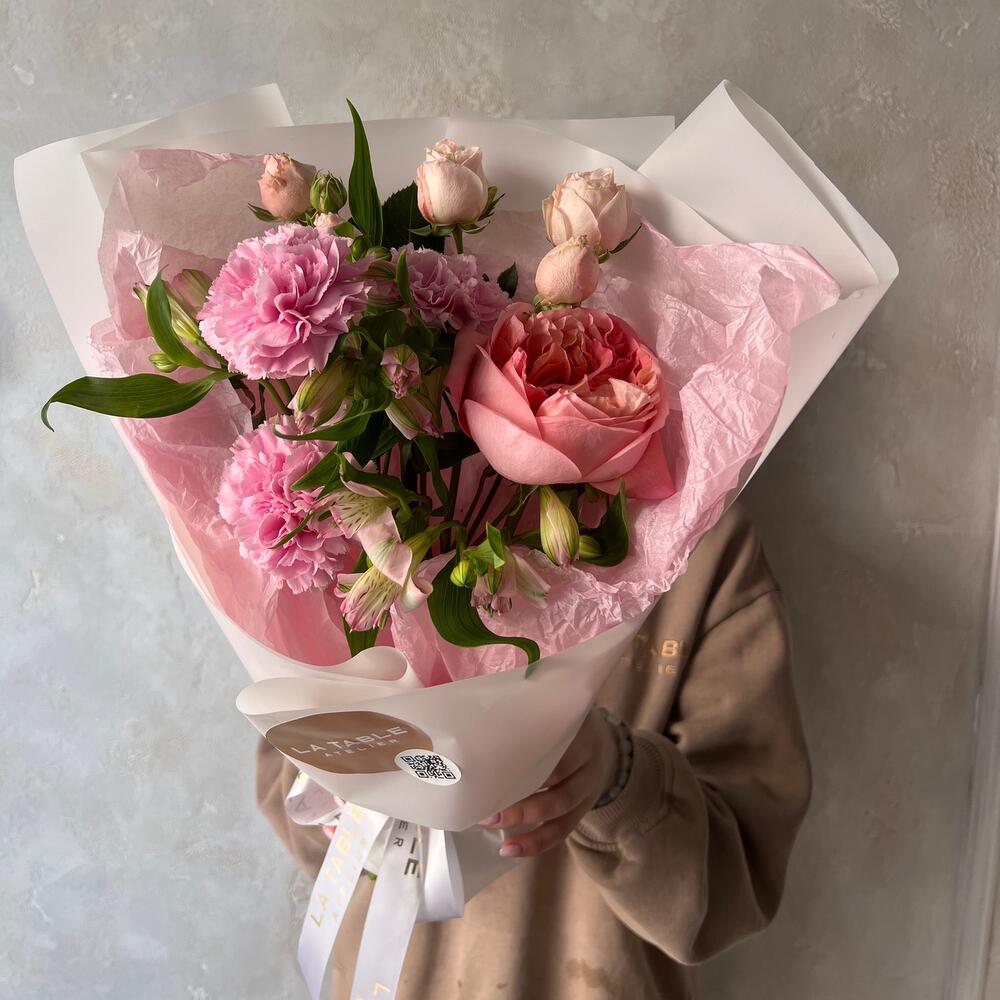 Роза кустовая пионовидная – 1 шт.Пионовидная роза – 1 шт.Альстромерия – 2 шт.Гвоздика – 2 шт.Упаковка дизайнерская – 1 шт.