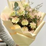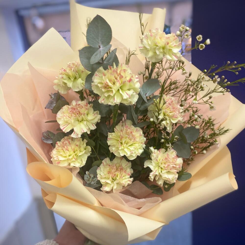 Диантус – 9 шт.Хамелациум – 1 шт.Эвкалипт – 1 шт.Упаковка дизайнерская – 2 шт.Лента – 1 шт.