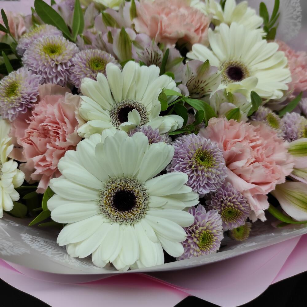 Гербера – 7 шт.Диантус – 6 шт.Альстромерия – 3 шт.Сантини – 5 шт.Фисташка – 3 шт.Пленка матовая – 1 шт.