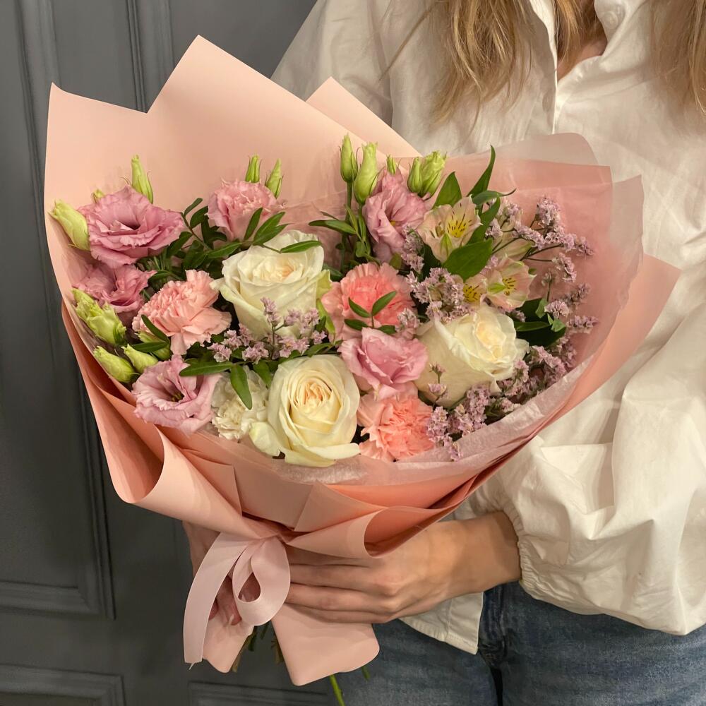 Роза – 3 шт.Диантус – 3 шт.Эустома – 2 шт.Альстромерия – 2 шт.Лимониум – 1 шт.Фисташка – 4 шт.Упаковка дизайнерская – 2 шт.