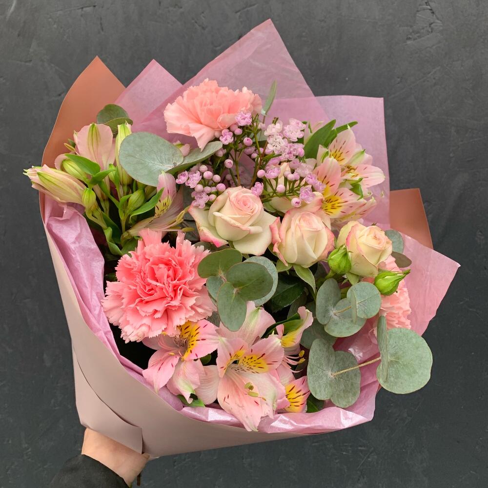 Гвоздика – 3 шт.Альстромерия – 3 шт.Роза кустовая – 1 шт.Ваксфлауэр – 1 шт.Эвкалипт – 2 шт.Упаковка дизайнерская – 2 шт.