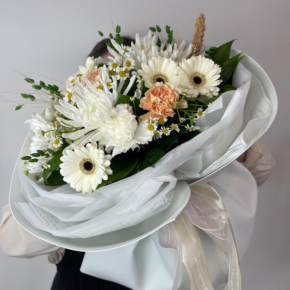 Матрикария – 5 шт.Диантус – 5 шт.Гербера – 5 шт.Хризантема – 3 шт.Салал пучок – 1 шт.фаомиран – 2 шт.Тишью – 6 шт.Лента атласная – 2 шт.бриза пучок – 1 шт.
