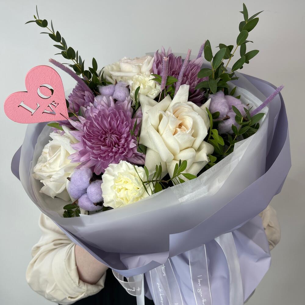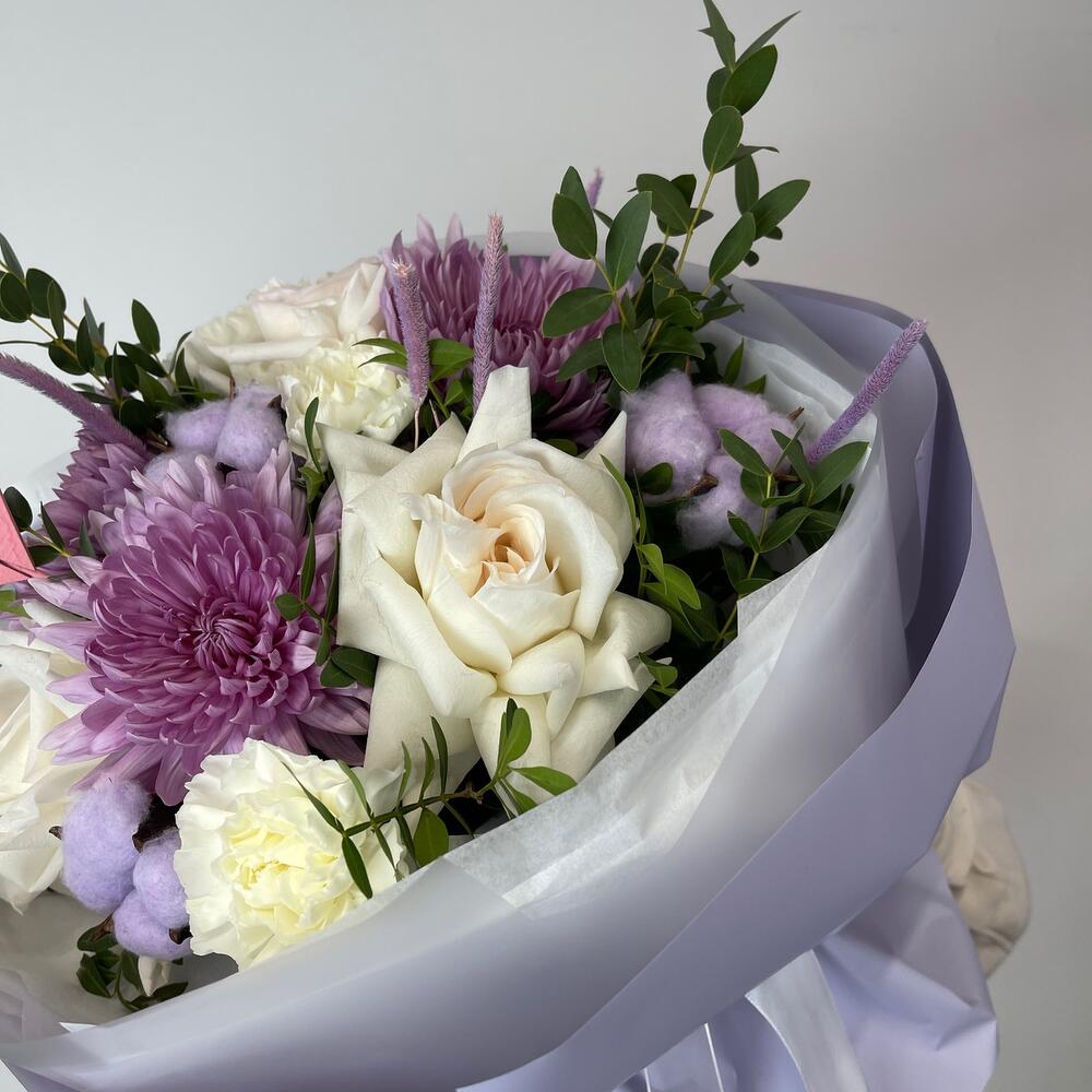 «Лавандовое созвездие» Букет из розы, гвоздики, статица и хлопка