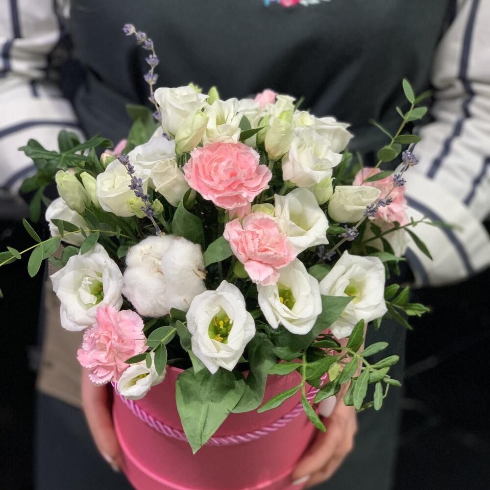 Коробочка из нежных эустомы и гвозички шабо, сухоцветами хлопком и лавандой, ароматным эвкалиптом.