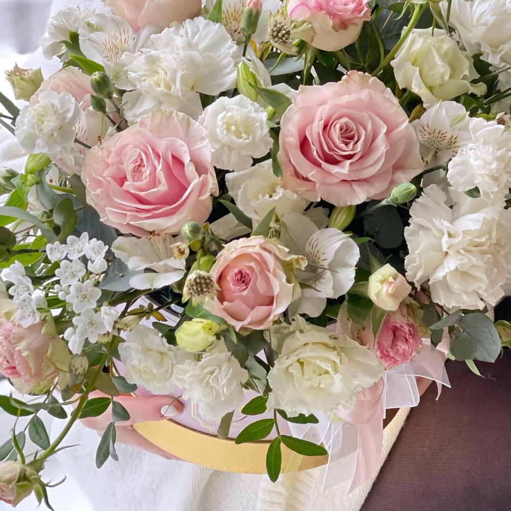 Роза – 3 шт.Роза кустовая – 2 шт.Лизиантус Алиса белый – 3 шт.Диантус сортовой – 4 шт.Альстромерия – 2 шт.Астранция – 2 шт.Эвкалипт – 2 шт.Фисташка – 2 шт.Коробка шляпная – 1 шт.Флористическая губка – 1 шт.Лента – 1 шт.