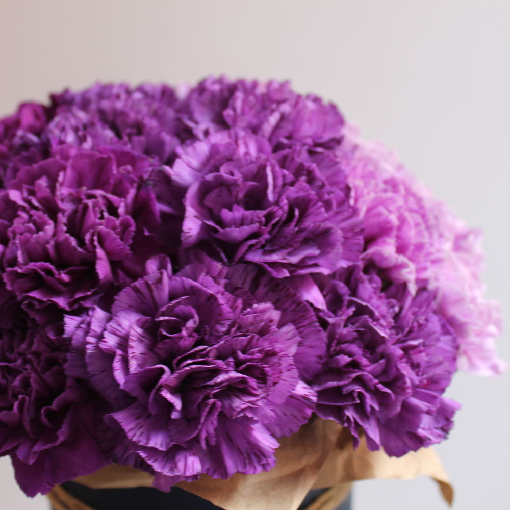 Гвоздика сортовая – 15 шт.Коробка шляпная – 1 шт.Оазис – 1 шт.бечевка – 1 шт.
