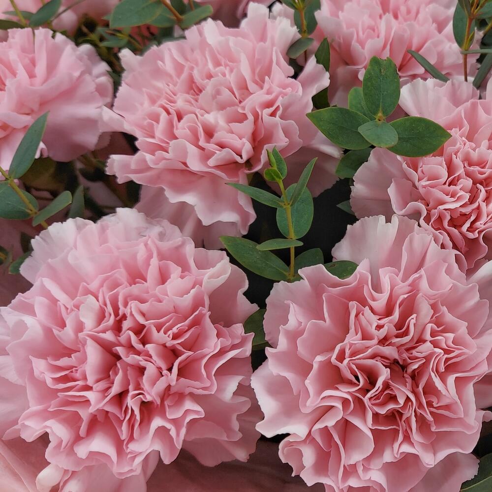 гвоздика сортовая (диантус) – 21 шт.Эвкалипт – 15 шт.Пистация – 10 шт.Упаковка тишью – 8 шт.Упаковка пленка матовая – 7 шт.Лента атласная – 1 шт.