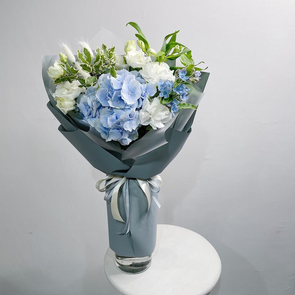Гортензия – 1 шт.Оксипеталум – 1 шт.Альстромерия – 1 шт.Лизиантус – 1 шт.Диантус – 2 шт.Питтоспорум – 1 шт.Лагурус – 3 шт.Упаковка дизайнерская – 1 шт.