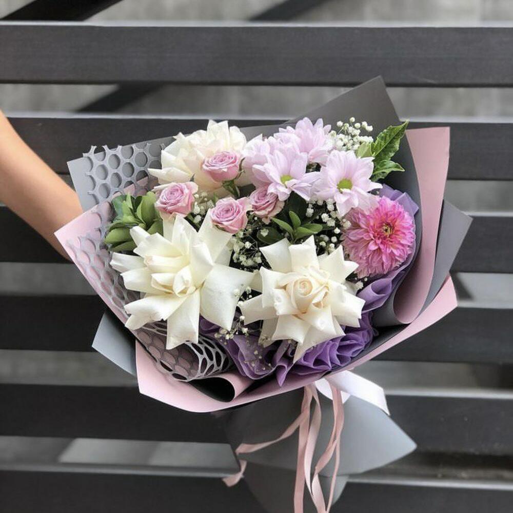Альстромерии, Гвоздики, Кустовые розы, Лизиантусы, Розы, Хризантемы