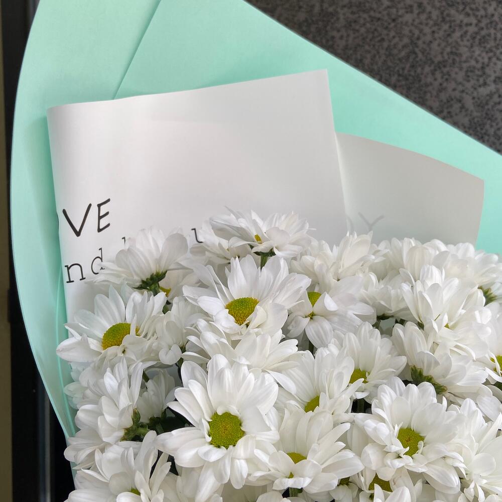 Лента атласная – 2 шт.Хризантема Ромашковая – 13 шт.Фоамиран (упаковка) – 4 шт.подложка бумажная – 2 шт.