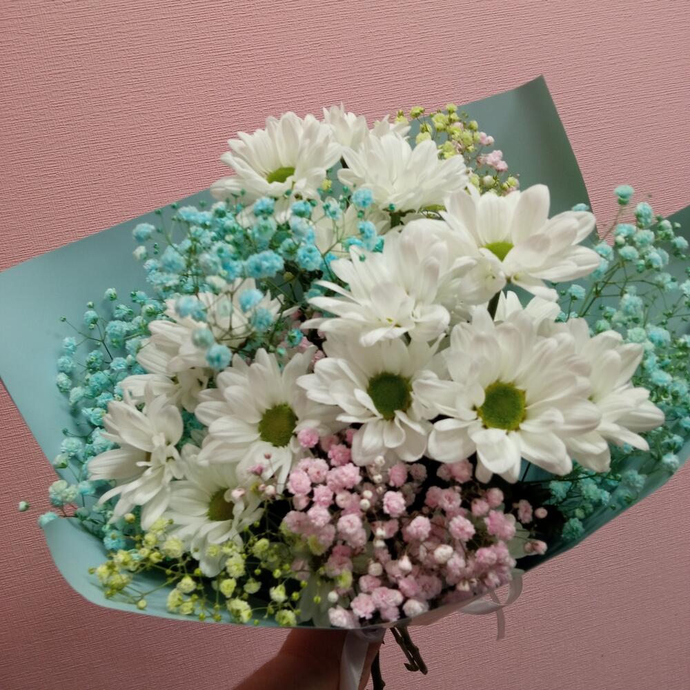 Лента – 1 шт.Хризантема кустовая – 3 шт.Упаковка – 1 шт.гипсофила радужная – 3 шт.