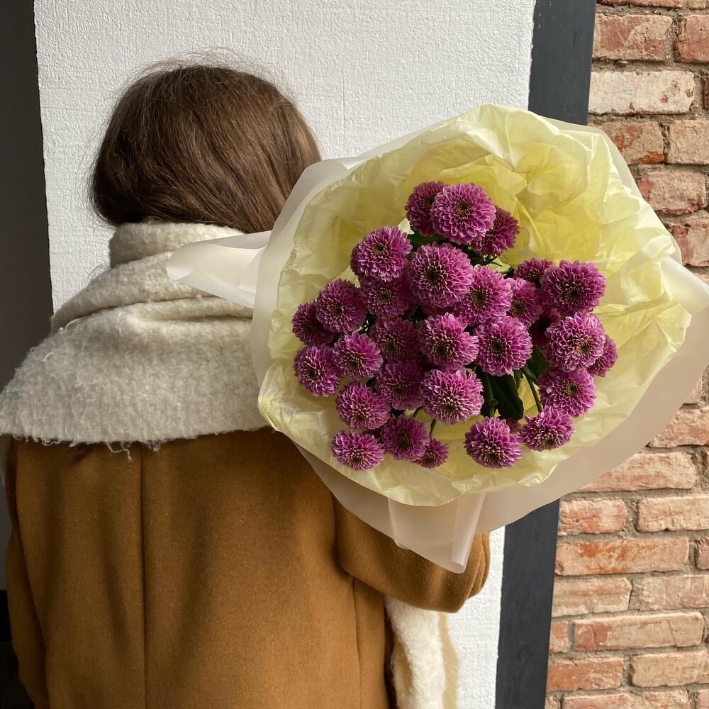 Хризантема помпон – 5 шт.Тишью – 2 шт.Упаковка дизайнерская – 4 шт.лента атласная брендированная – 1 шт.
