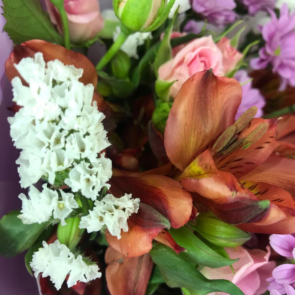 Роза кустовая – 3 шт.Альстромерия – 3 шт.Сантини – 3 шт.Статица – 1 шт.Упаковка дизайнерская – 2 шт.