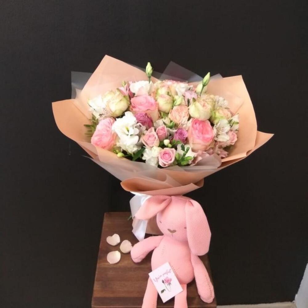 Альстромерия – 2 шт.Лизиантус – 2 шт.Фрезия – 5 шт.Кустовая роза – 5 шт.Атласная лента – 1 шт.Фисташка пучок – 2 шт.Роза одноголовая пионовидная – 2 шт.Карточка для подписи – 1 шт.Роза одноголовая эквадор 50 см – 2 шт.Пленка корейская – 2 шт.Прищепка – 1 шт.роза кения – 5 шт.
