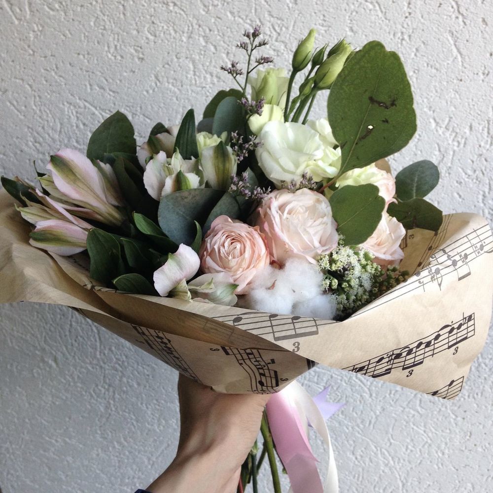 Изящный букет, выполненный в пастельных тонах, с мягким хлопком и листьями эвкалипта. Точно понравится утонченным натурам! Желателен предварительный заказ