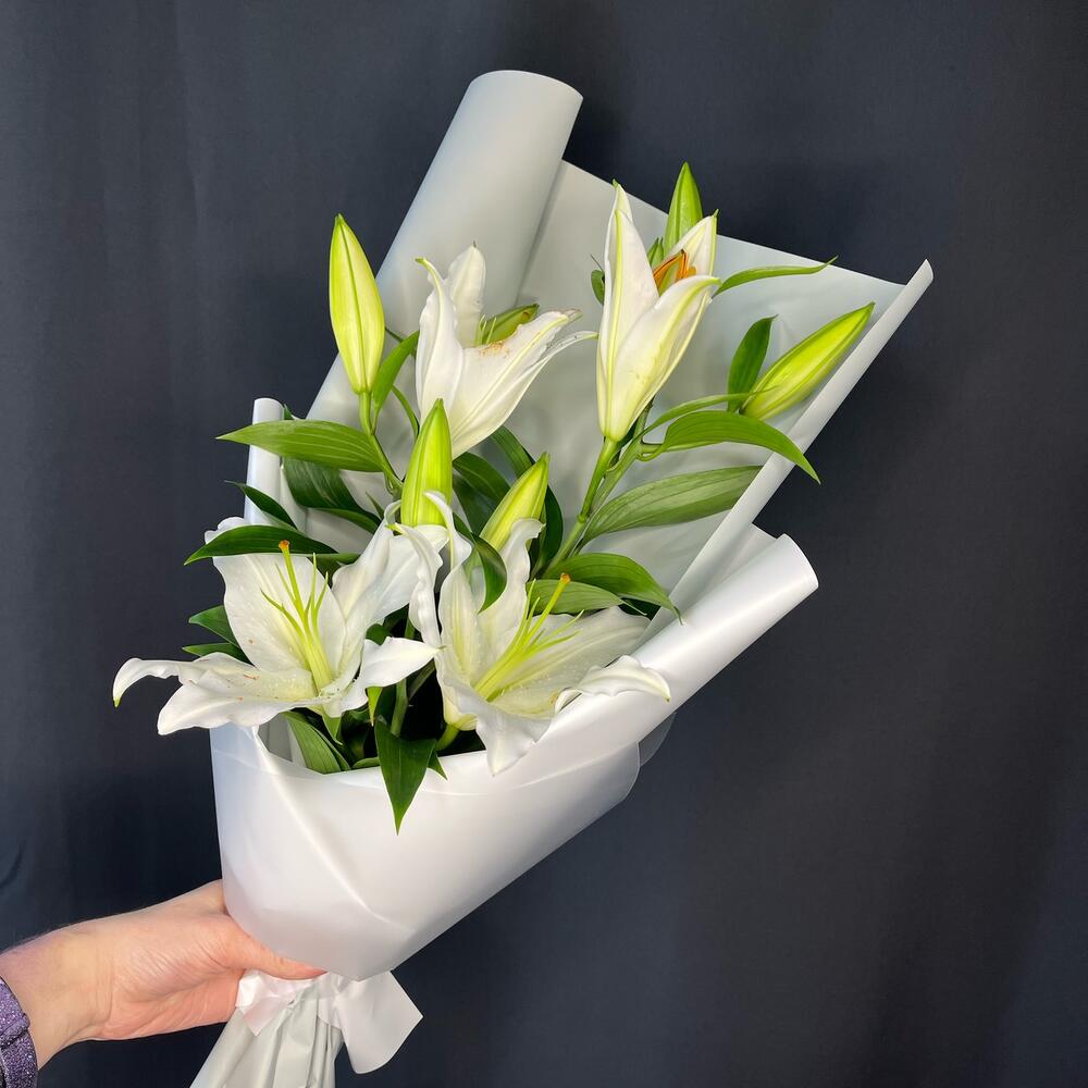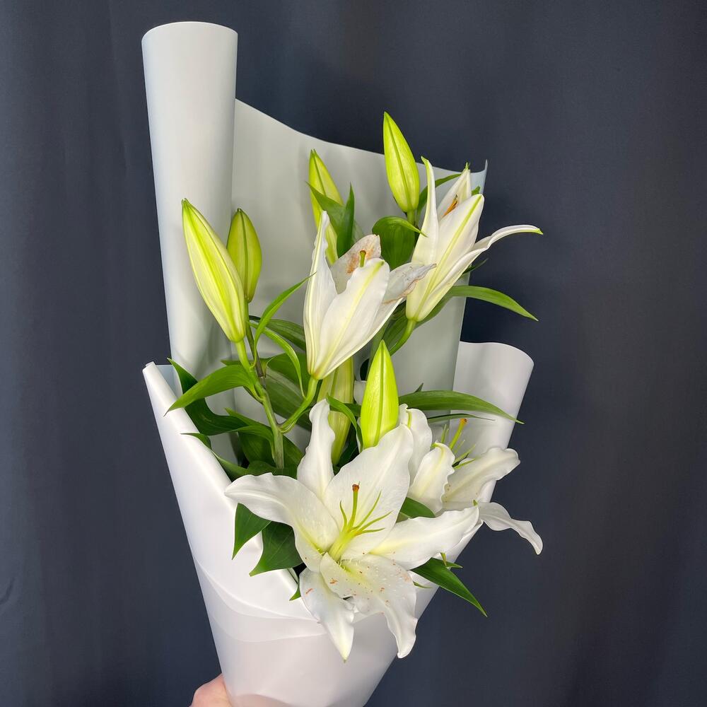 Лилия белая – 3 шт.Пленка матовая – 2 шт.Лента атласная – 1 шт.