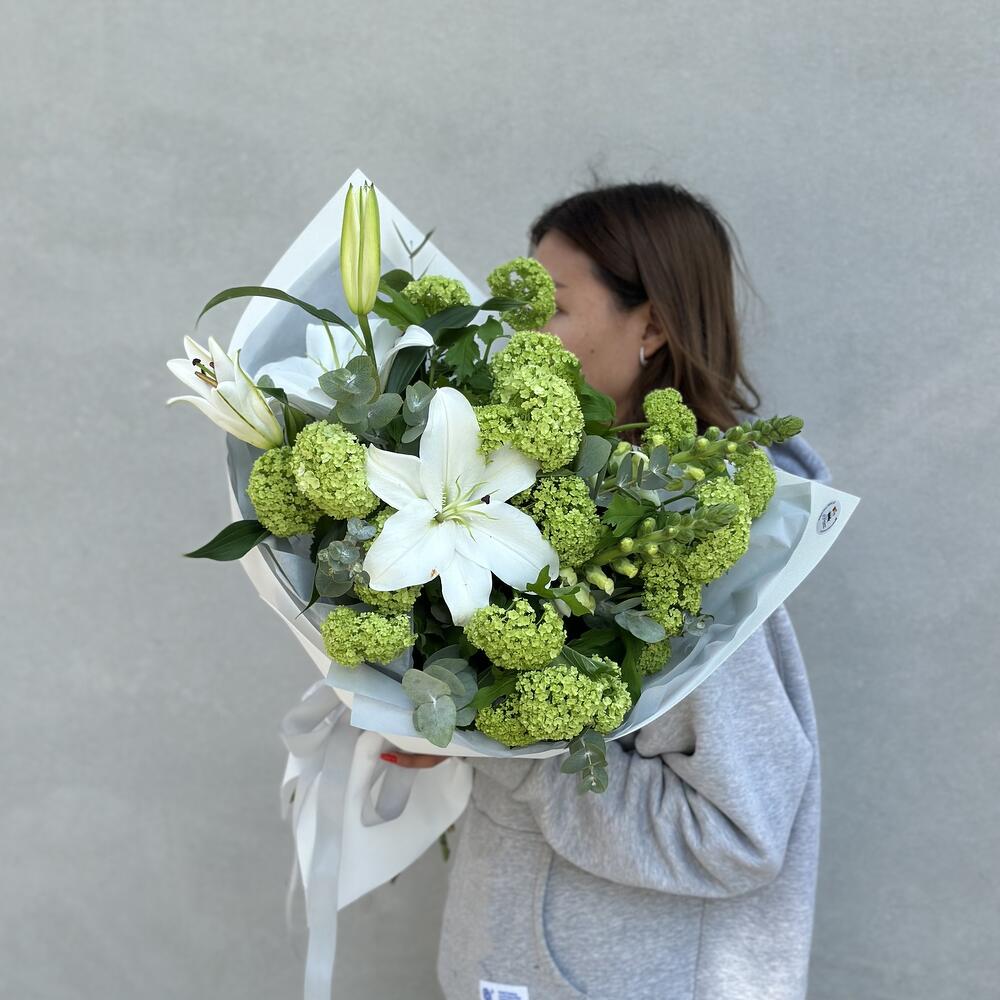 Лилия – 1 шт. Львиный зев – 2 шт. Вибурнум – 7 шт. Эвкалипт – 2 шт.