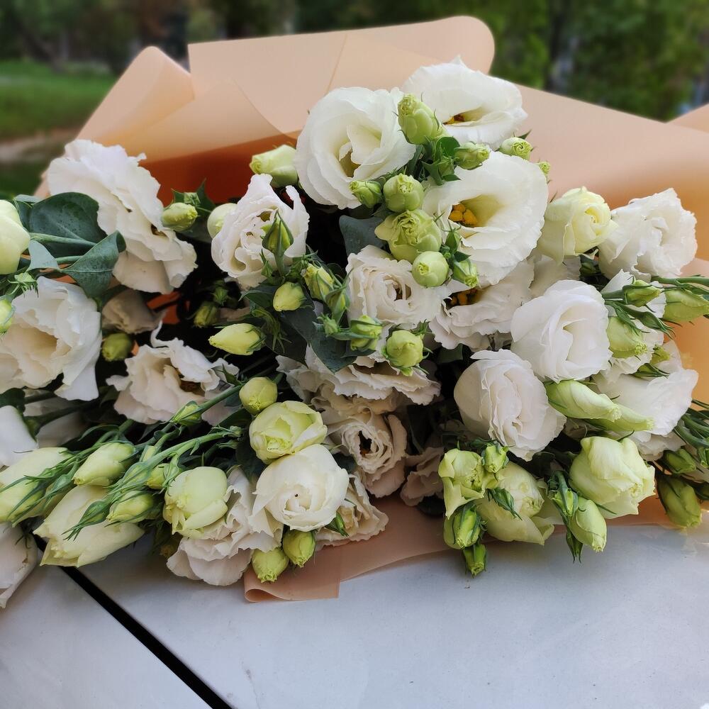 Красивый букет белоснежных эустом, оформленный во флористическую кальку светлых оттенков.