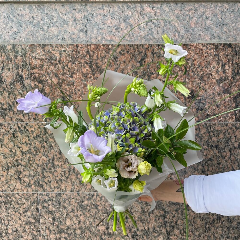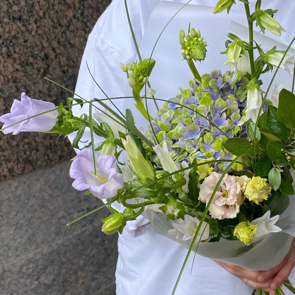 Гортензия – 1 шт.Кампанула – 3 шт.Упаковка – 1 шт.Эустома – 1 шт.Лента атласная – 1 шт.Орнитогалум – 2 шт.зелень сезонная микс – 2 шт.