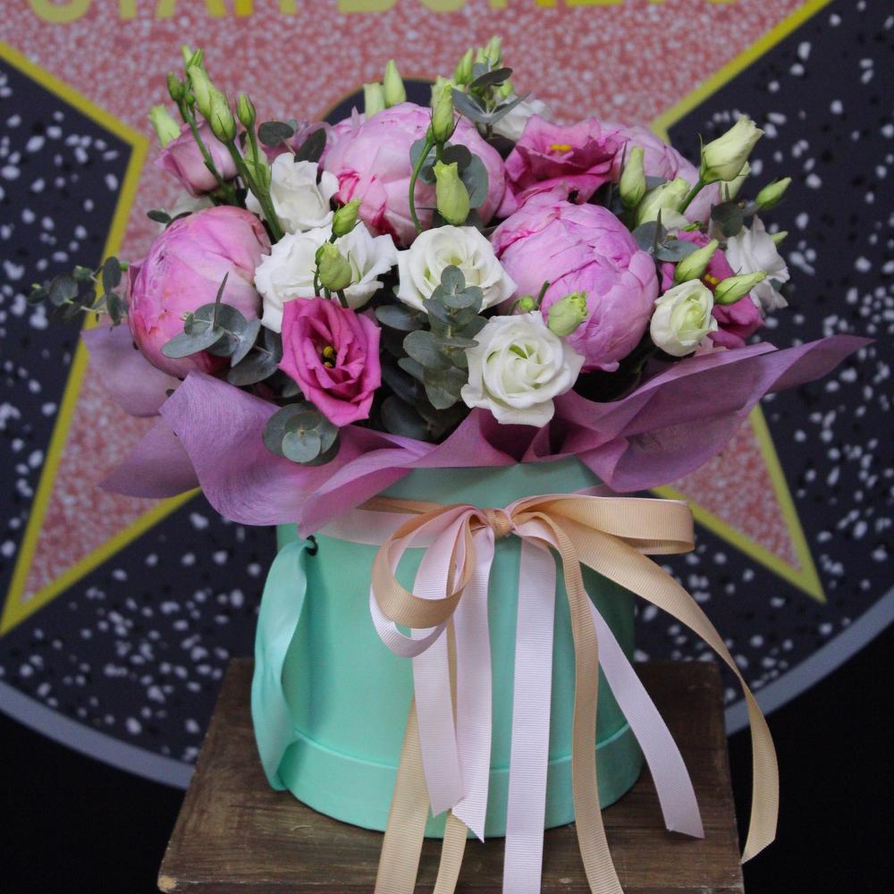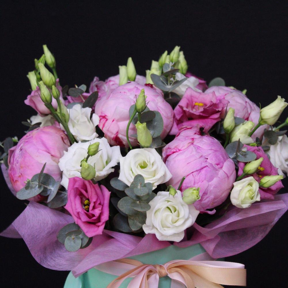 Пион Сара Бернар – 5 шт.эустома микс – 5 шт.Эвкалипт – 3 шт.Оазис флористический – 1 шт.Коробка шляпная – 1 шт.Лента атласная – 2 шт.