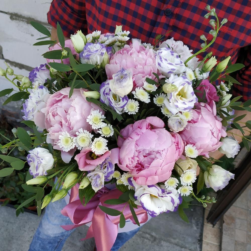 Пион – 5 шт.Лизиантус – 3 шт.Сталион – 3 шт.Эвкалипт – 3 шт.Зелень – 1 шт.Оазис – 1 шт.Коробка шляпная – 1 шт.Лента атласная – 1 шт.