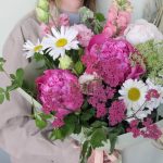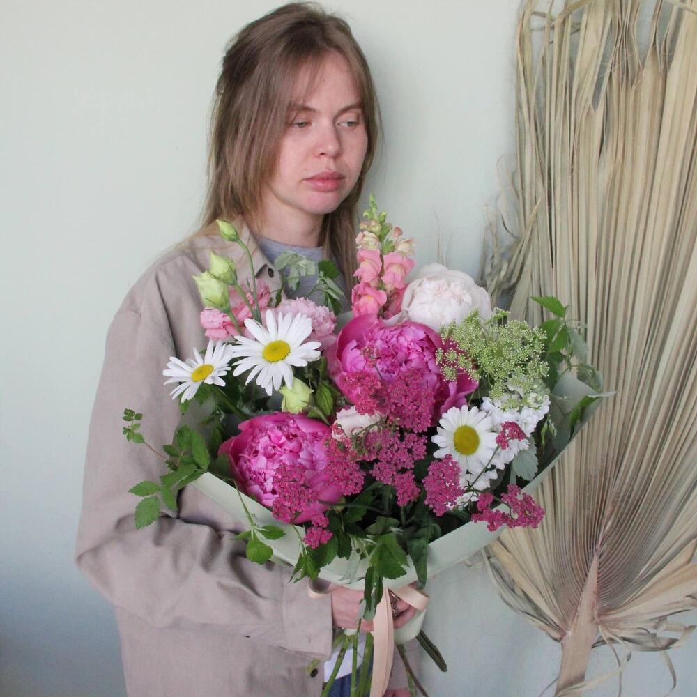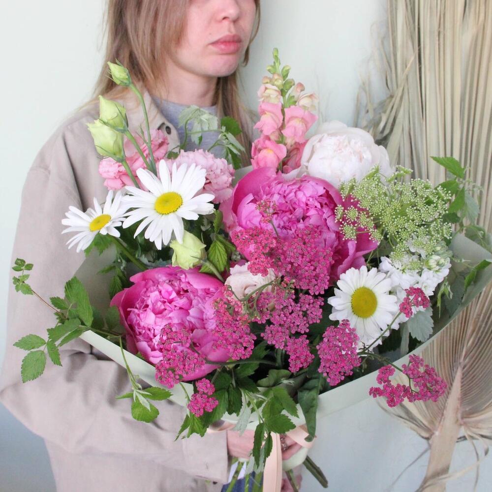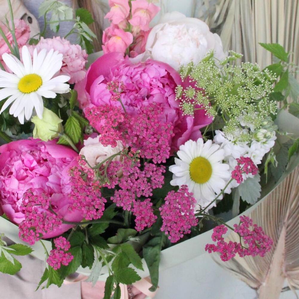 Ромашка – 3 шт.Пион – 3 шт.Львиный зев – 2 шт.Ахиллея – 1 шт.Лизиантус – 2 шт.Амми – 1 шт.Ветки малины – 3 шт.Маттиола – 1 шт.Фисташка – 2 шт.Упаковка – 1 шт.Лента – 1 шт.