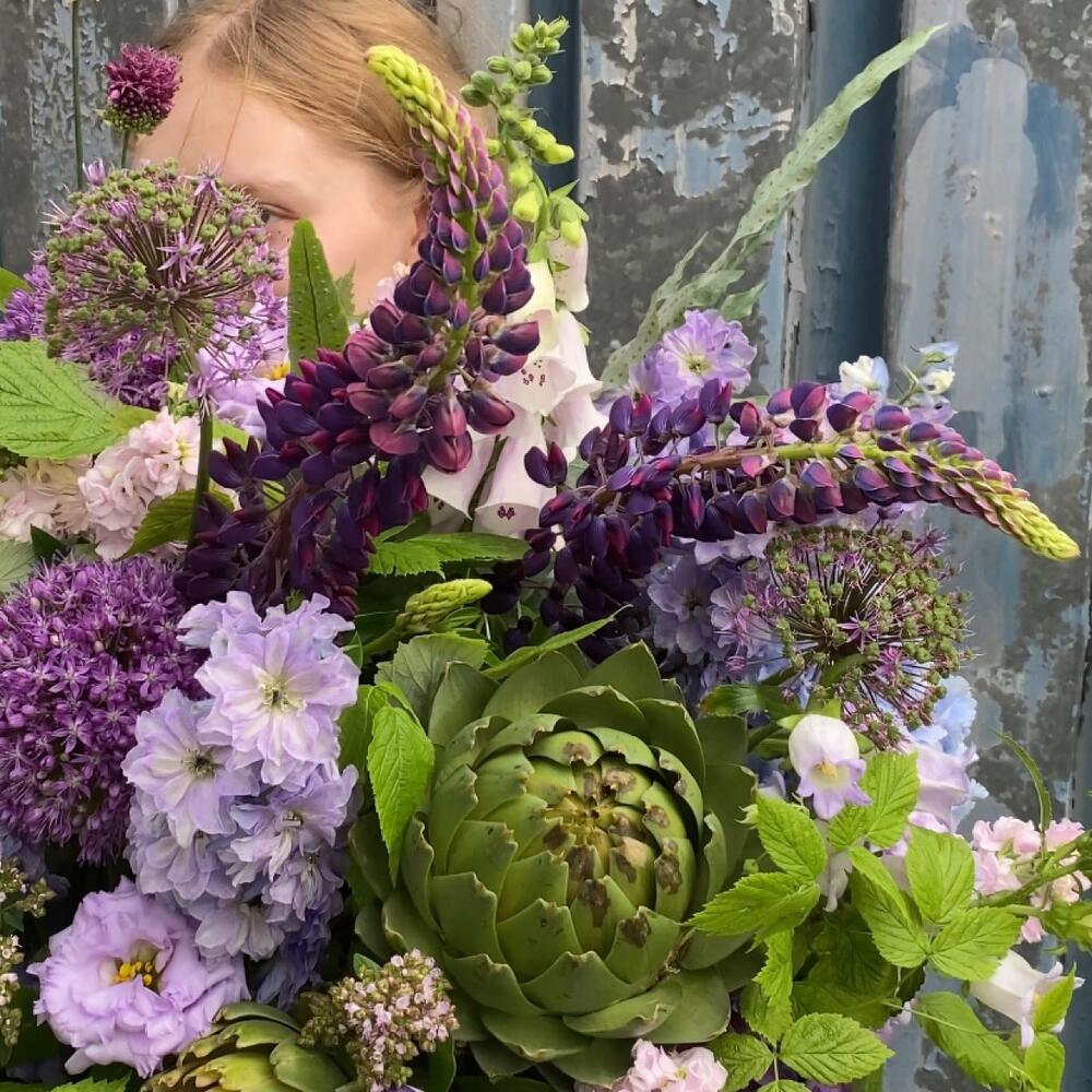 Артишок – 2 шт.Люпин – 3 шт.Дельфиниум – 5 шт.Клематис – 3 шт.Гортензия – 3 шт.Аллиум – 7 шт.Лизиантус – 5 шт.Колокольчик – 3 шт.Маттиола – 7 шт.Малина – 9 шт.Травы – 9 шт.Оазис флористический – 3 шт.Корзина – 1 шт.